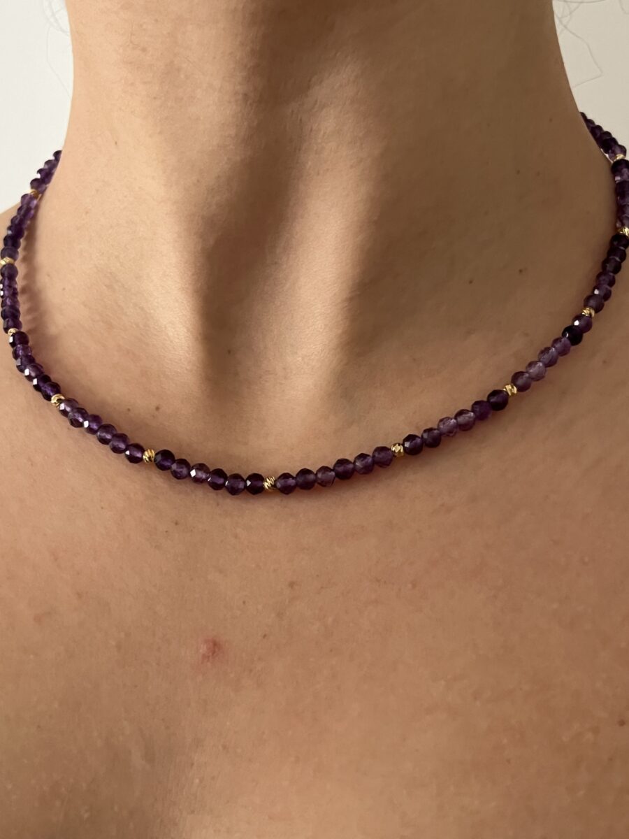3mm ametist taşlar kolyeye sade, modern ve çok şık bir görünüm kazandırır. Morun asil tonları her cilt rengine uyum sağlar, tek başına kullanılabileceği gibi katmanlı kolyelerle de mükemmel kombinlenir.