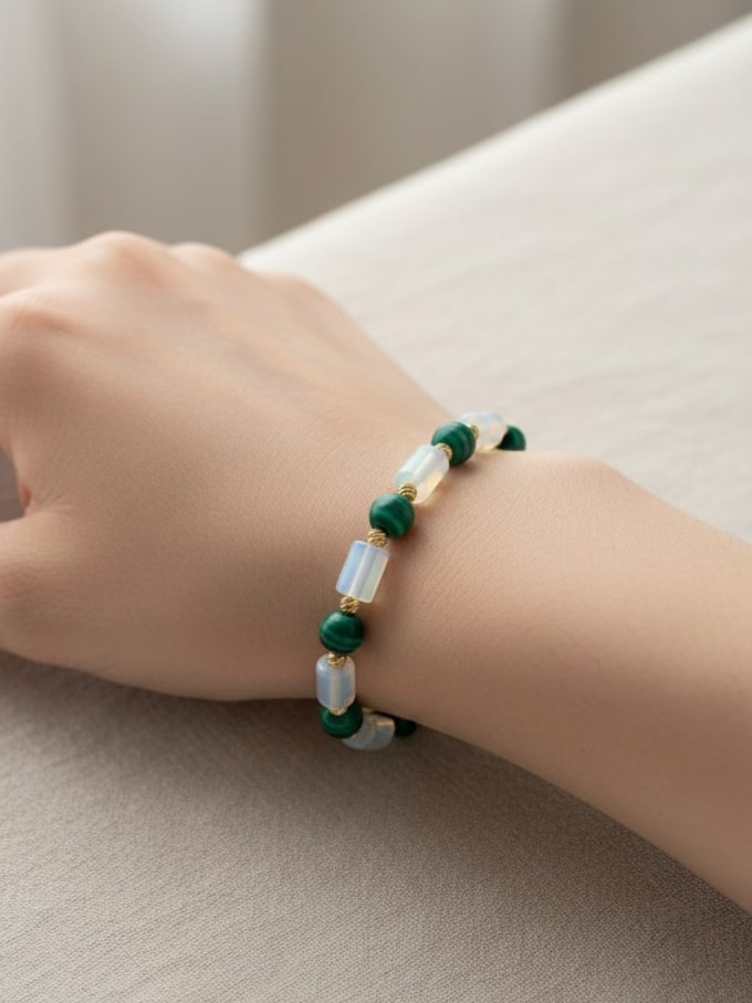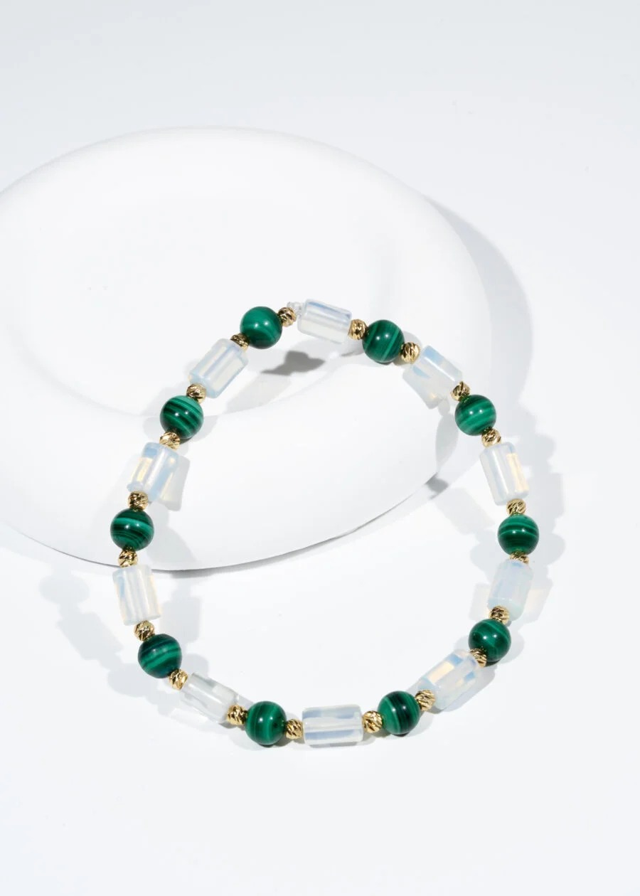 Doğanın derin yeşili ile ay ışığının mistik parıltısını bileğinizde buluşturan bu zarif bileklik, hem enerjisi hem de estetik görünümüyle dikkat çekiyor. Güçlü koruyucu taş Malakit’in enerjisi, Ay Taşı’nın (veya opalitin) huzur veren ışıltısıyla birleşti.