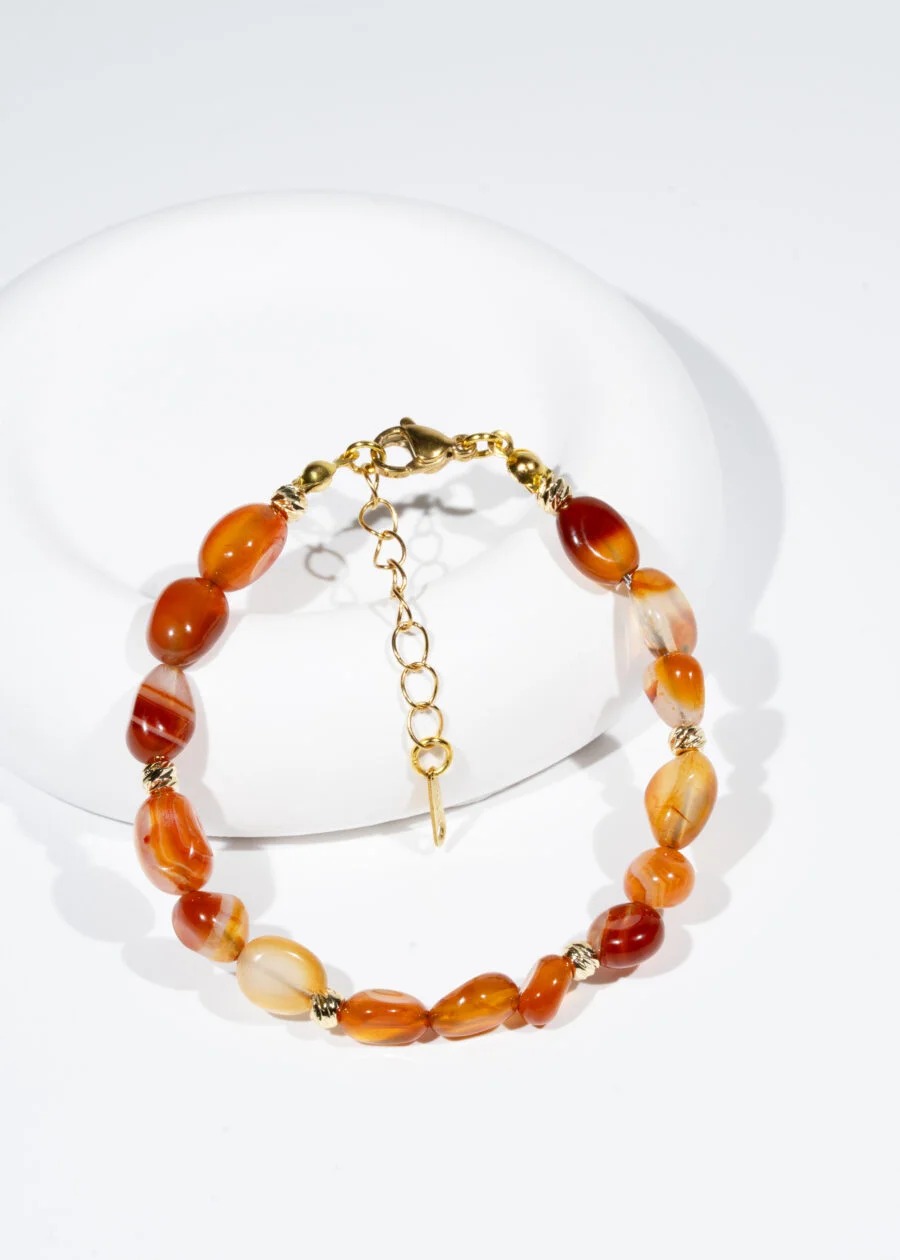 Sıcaklığın, cesaretin ve motivasyonun taşı olan Karnelyan (Kırmızı Akik), ateşli enerjisini bileğinize taşıyor. Kırık taş formu, her parçanın benzersizliğini korurken, altın kaplama detaylar modern bir zarafet katıyor.