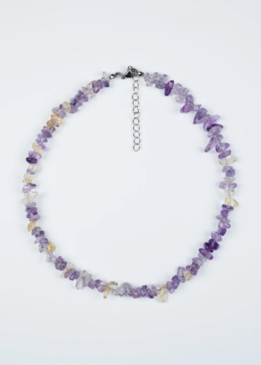 Doğanın iki güçlü enerjisini, mor Ametist’in sakinliğini ve sarı Sitrin’in neşesini bir araya getiren bu kolye, hem görsel bir şölen sunar hem de pozitif bir enerji yayar. Kırık taşların otantik formu, kolyeyi eşsiz bir tılsım haline getiriyor.