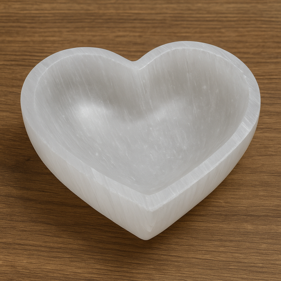 Selenit Kalp Kase 10 cm, saf enerjisi ve zarif tasarımıyla hem ruhsal dengeyi destekleyen hem de dekoratif olarak etkileyici bir doğal taş objesidir. 💫