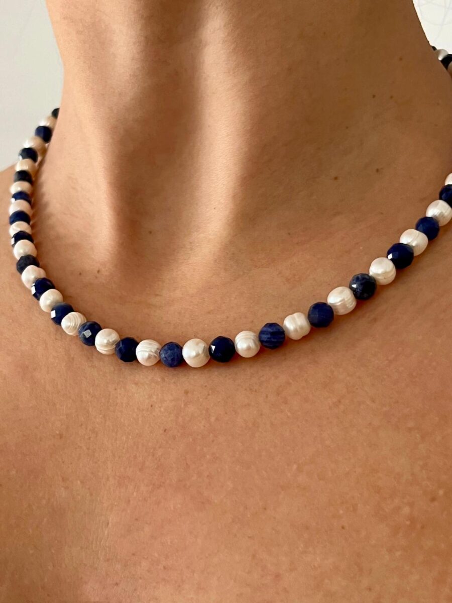 Tasarım: Kısa kolye (choker) formunda tasarlanan bu parça, Sodalit ve incilerin dengeli sıralamasıyla dikkat çeker.
